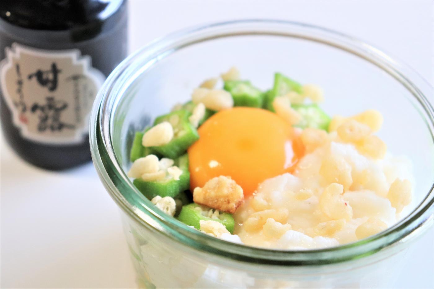 長芋・オクラ・天かす・卵黄、食べる直前にお醤油をちょろっとかけていただきます。