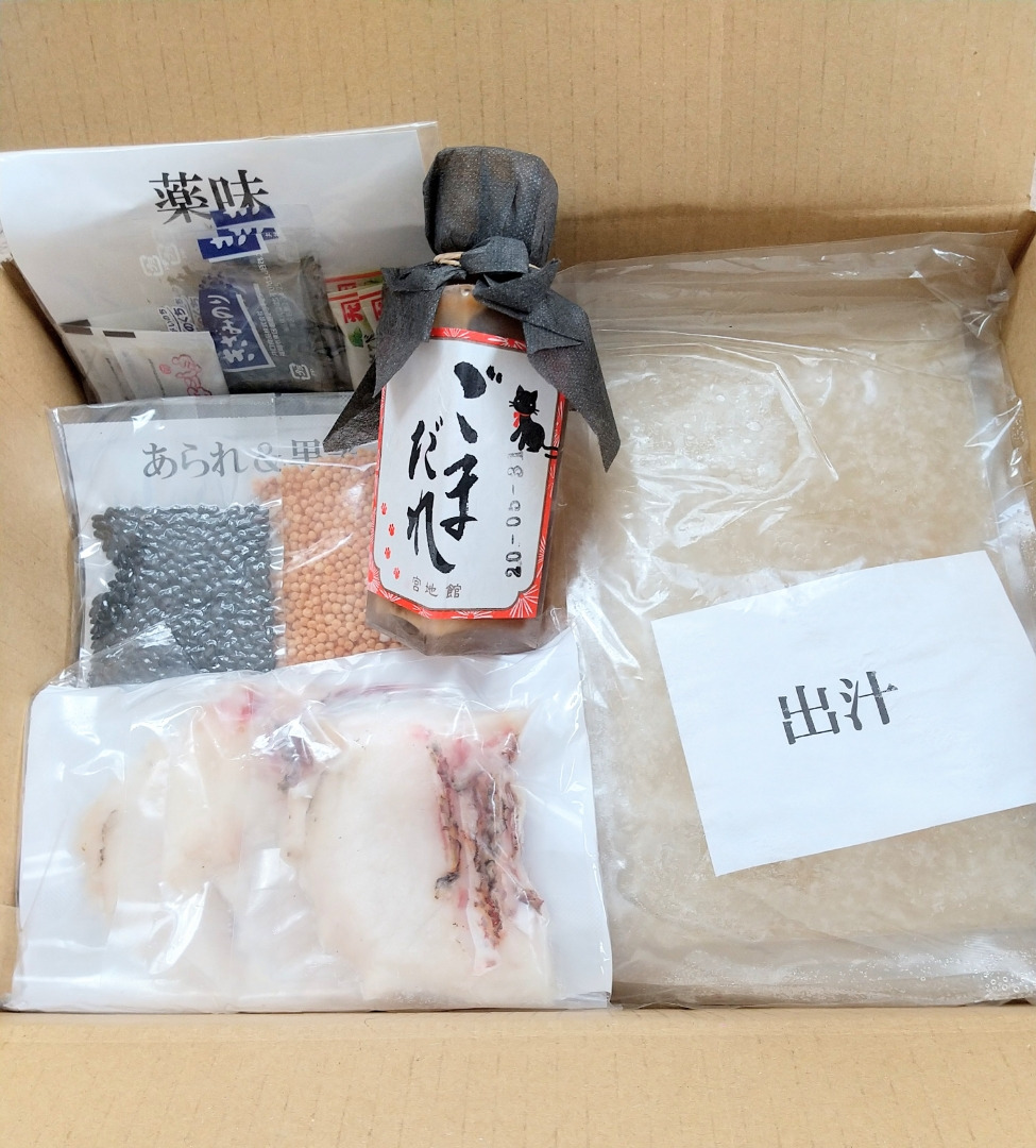 セットの中には鯛、ごまだれ、黒米、出汁、あられ、