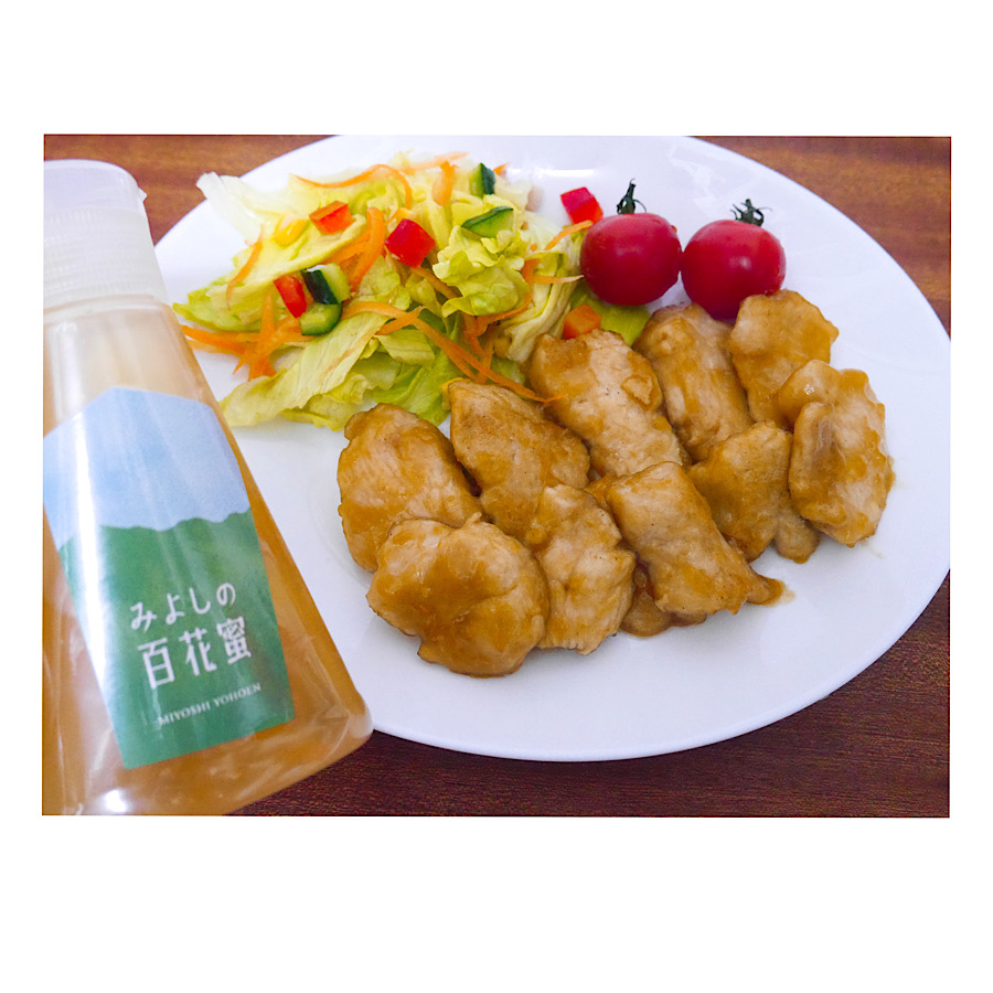 普段食べるヘルシーで安い胸肉が、この、みよしの百花蜜を使うことで、お肉は柔らかくジューシーに仕上がります☺️