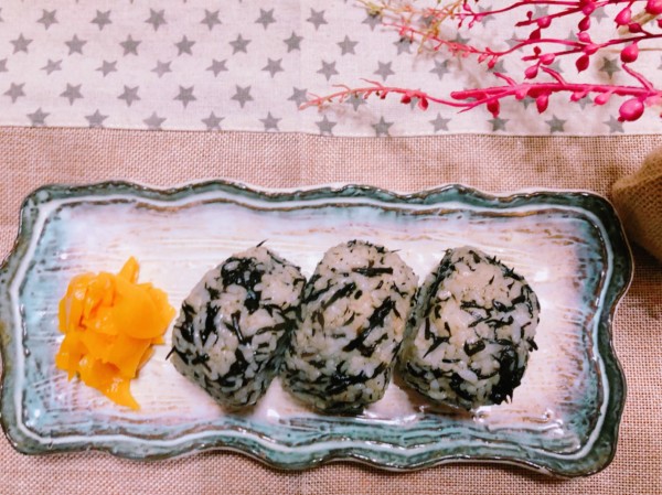 ご飯にちょっとおおめにひじきのしそ味を混ぜておにぎりにしてみました?
