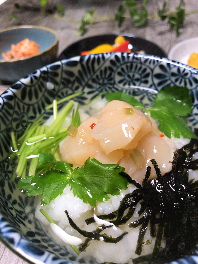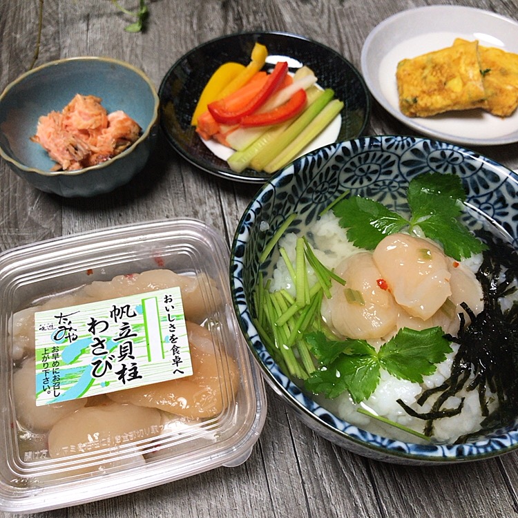 新鮮な生ホタテの甘さと旨みが凝縮されてるところに、わさびの香りと調味液がしっかりしみていて、