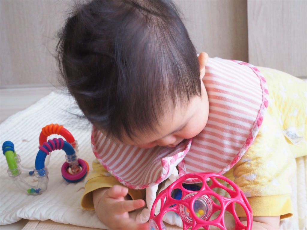首座りやおすわりの時期にはおもちゃを与えたい時期ですが、縫い目の部分で良い具合におもちゃが止まってくれて、イブルの上で子供とおもちゃの空間が完成します。