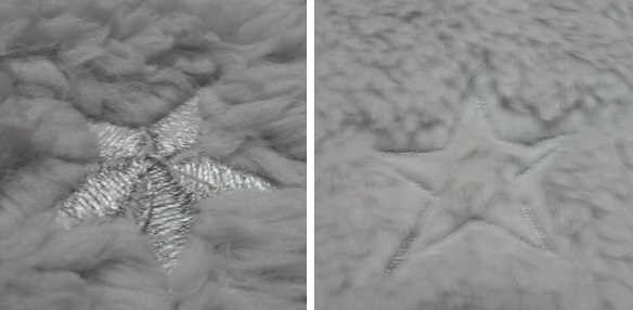 刺繍ミシンと型押しを巧みに使い、2種類の★の刺繍が施してあります。凹凸がかわいい♪