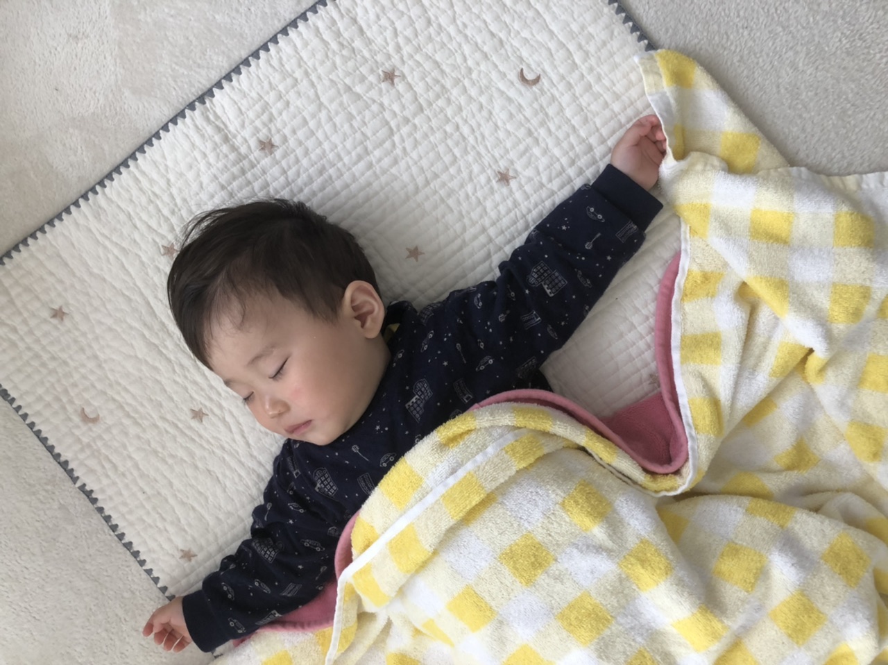 新生児の頃であればこのサイズ感で十分かと思います。逆に寝返り練習などで下に敷いてあげたい場合はもう少し大きめサイズの選択がいいかと思います。
