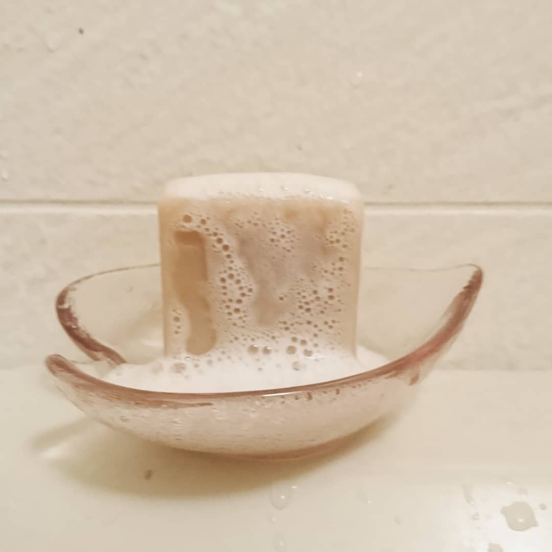 お湯でぬらした手でクレンジングバーを泡立てます。