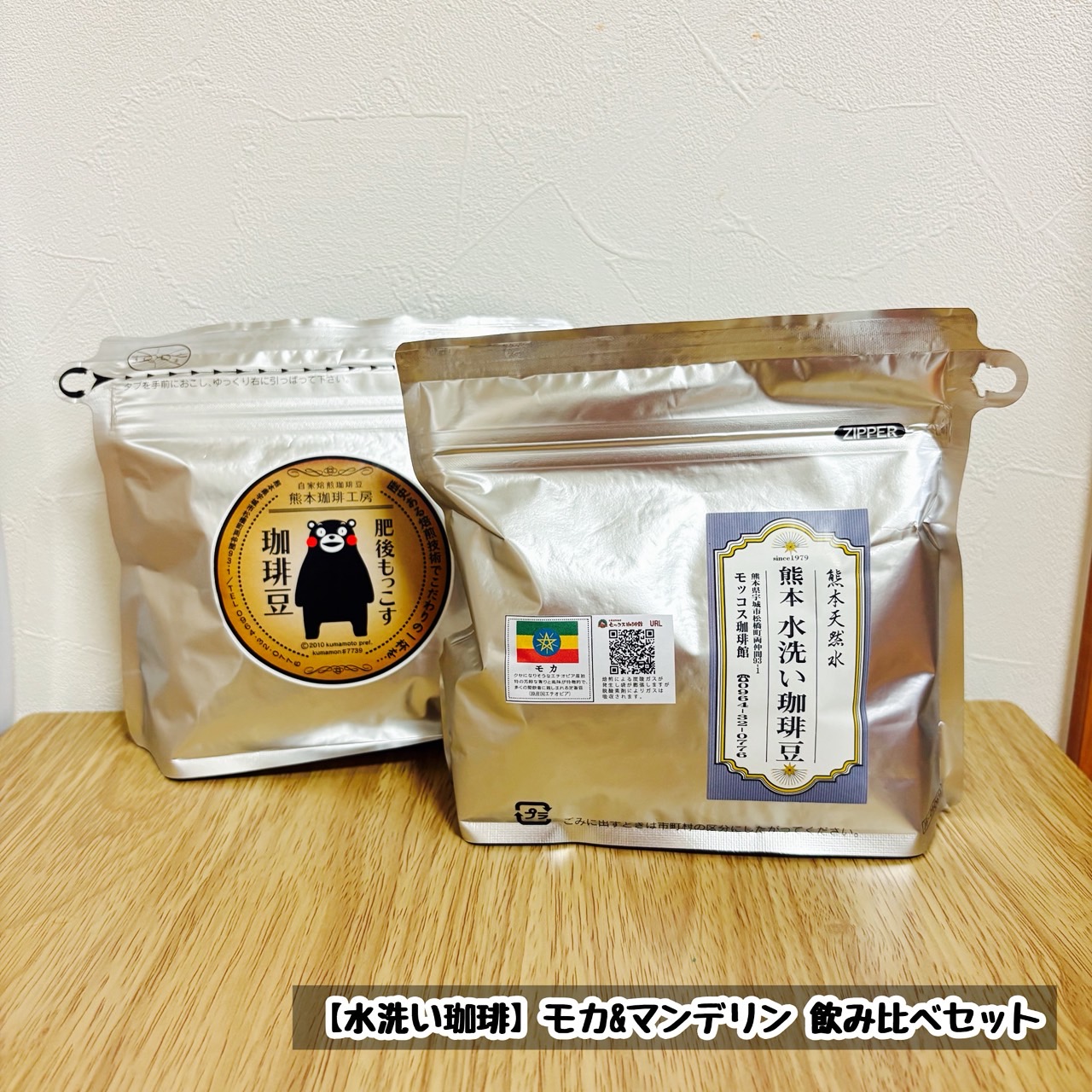 水洗い珈琲モカ&マンデリン飲み比べセットは、生豆を熊本の天然水で洗浄した「水洗い珈琲豆」で構成された、モカ(エチオピア産)とマンデリンG-1(インドネシア産)のセットです🤗