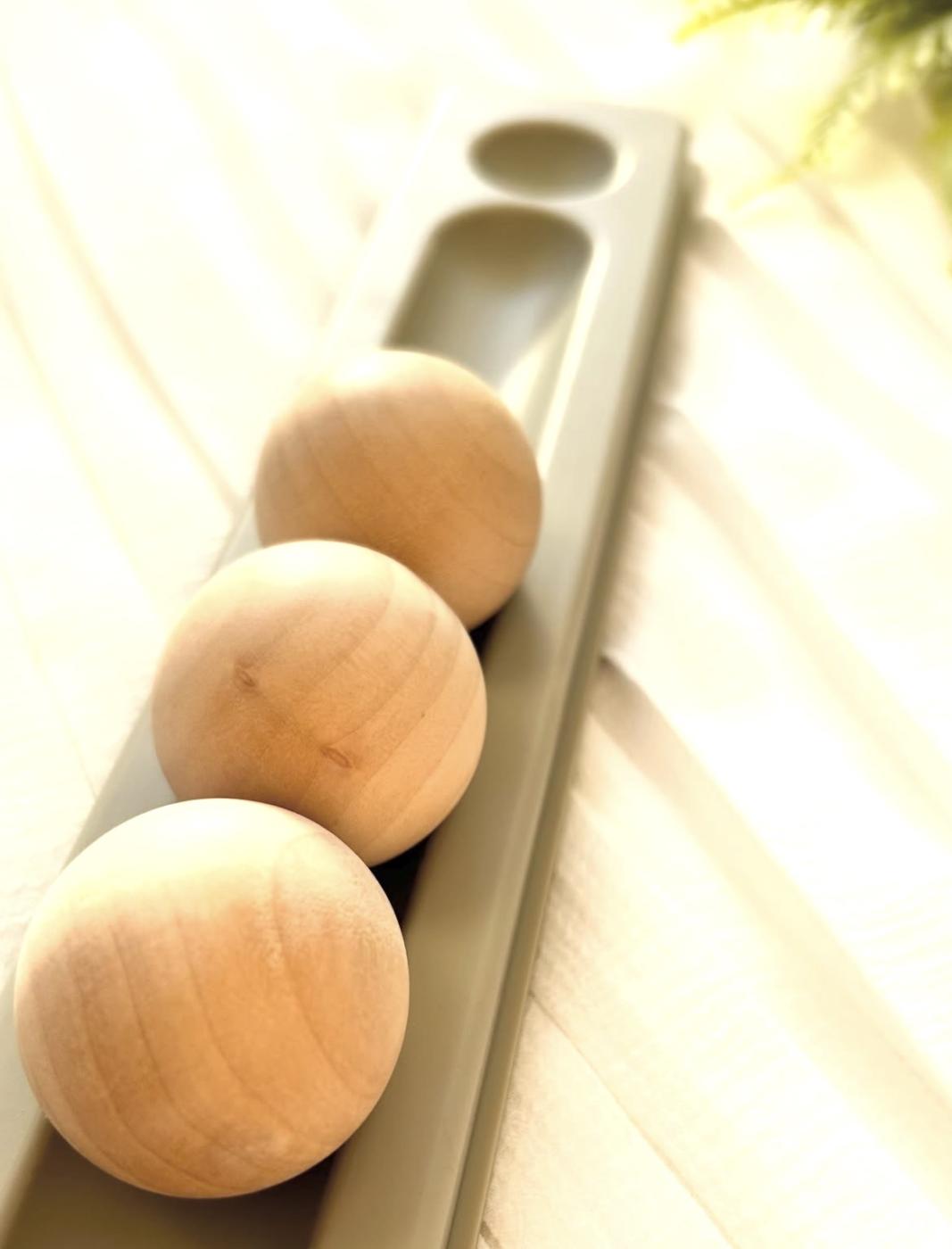 シリコン製のマットと、木でできた3つのウッドボールを組み合わせた見慣れないアイテム。 足裏のストレ...