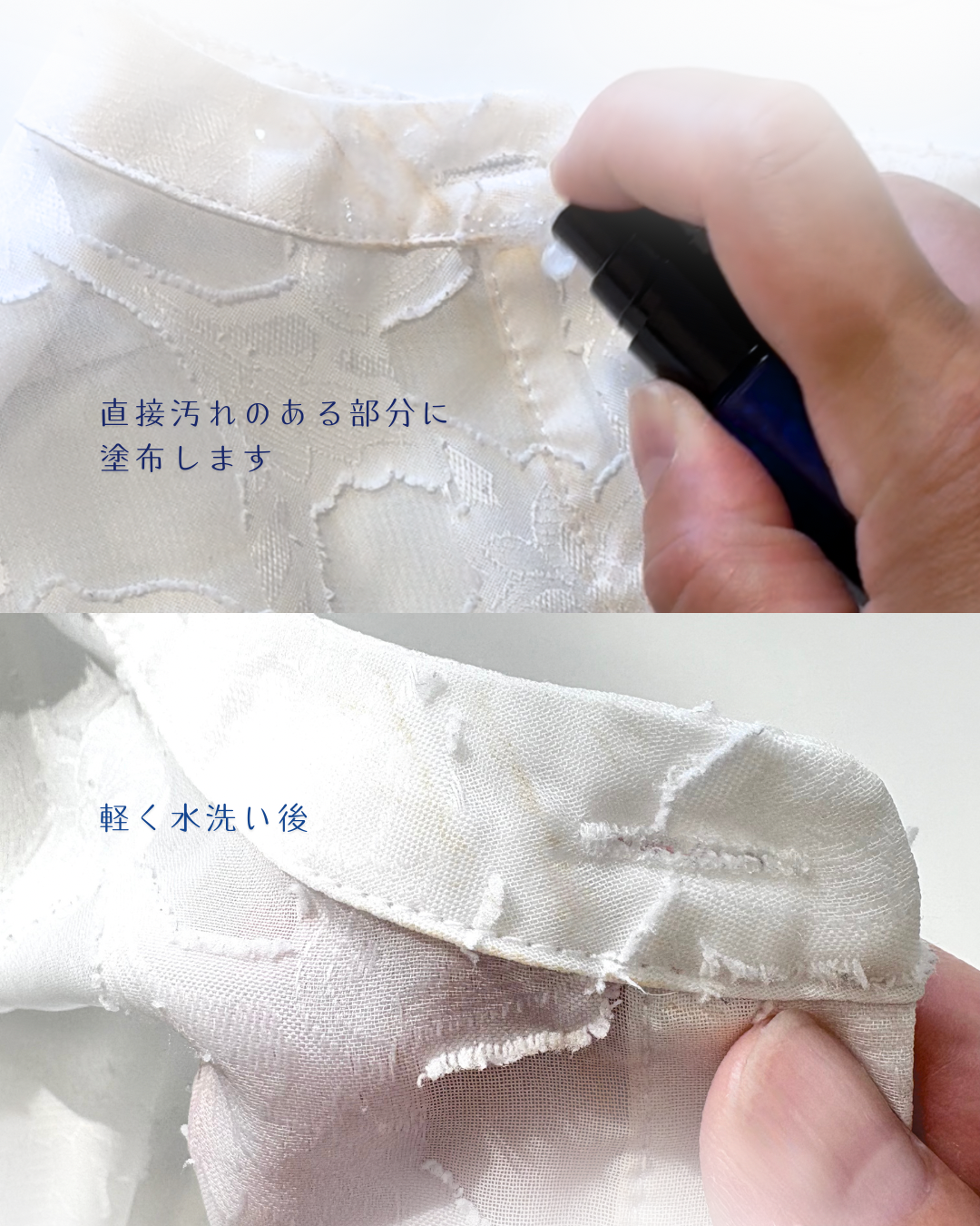 化粧・経血・食事・花粉などの汚れが付着した際に、さっと吹きかけることで汚れを簡単に落とすことが出...