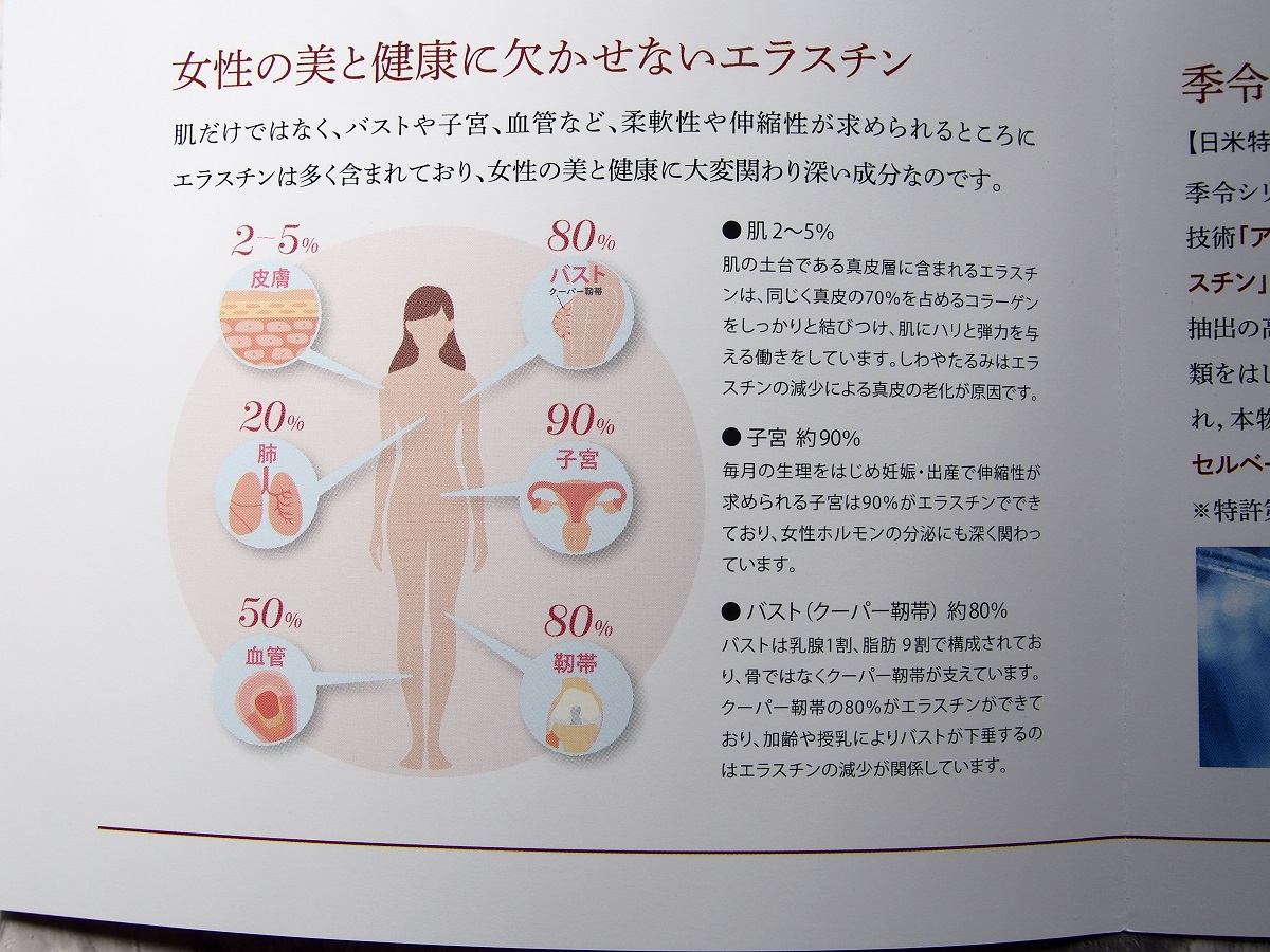 そんな折、「季令エラスチンカプセル」を頂いてお試しさせていただきました。実はエラスチンは女性の美に欠かせない成分なのだそうです。