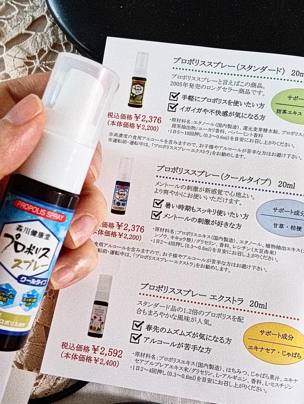 3種類用意されているそうで、こちらはアルコール含有のため、小さなお子様や車の運転、高所での作業中の方は別タイプを。また、メントールのスースー感が苦手な方も同様に別のタイプのプロポリススプレーがオススメです。