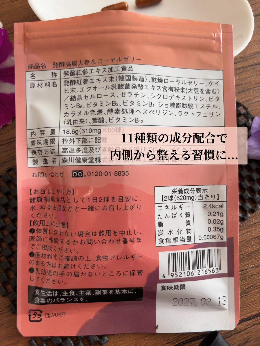 発酵高麗人参やローヤルゼリー、エクオール含有の乳酸菌発酵エキスなど、複数の成分が配合されているのが特徴みたい☝️