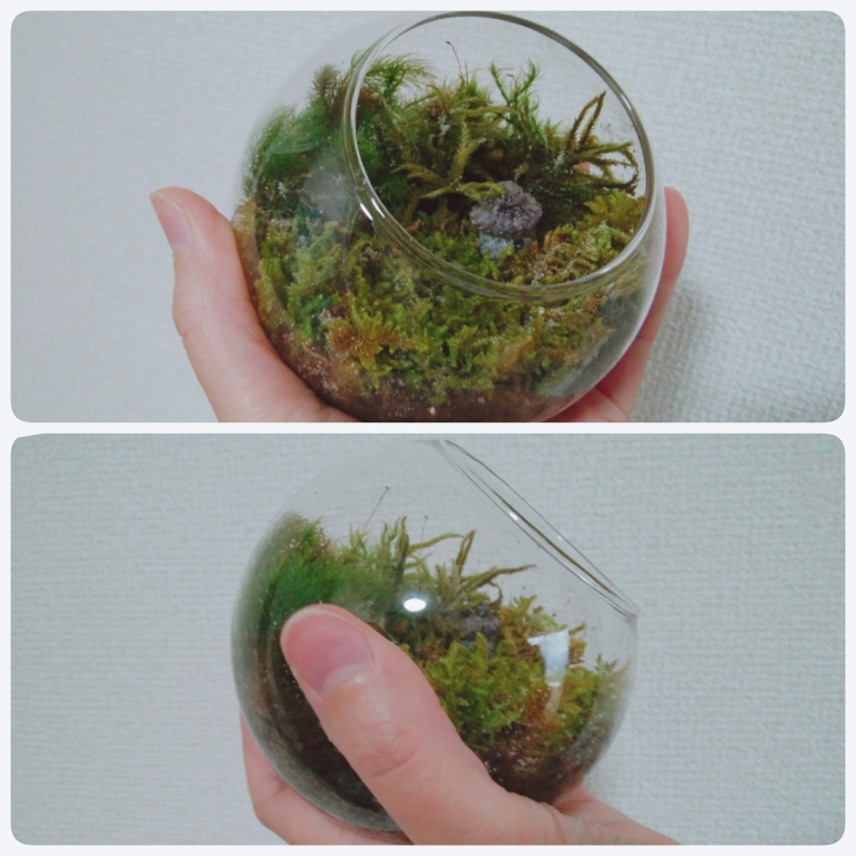 ボトルの中で適度な湿度が保たれるため、オープンのテラリウム、盆景と比べて育成や管理も容易だそうで、私には最適なものでした。