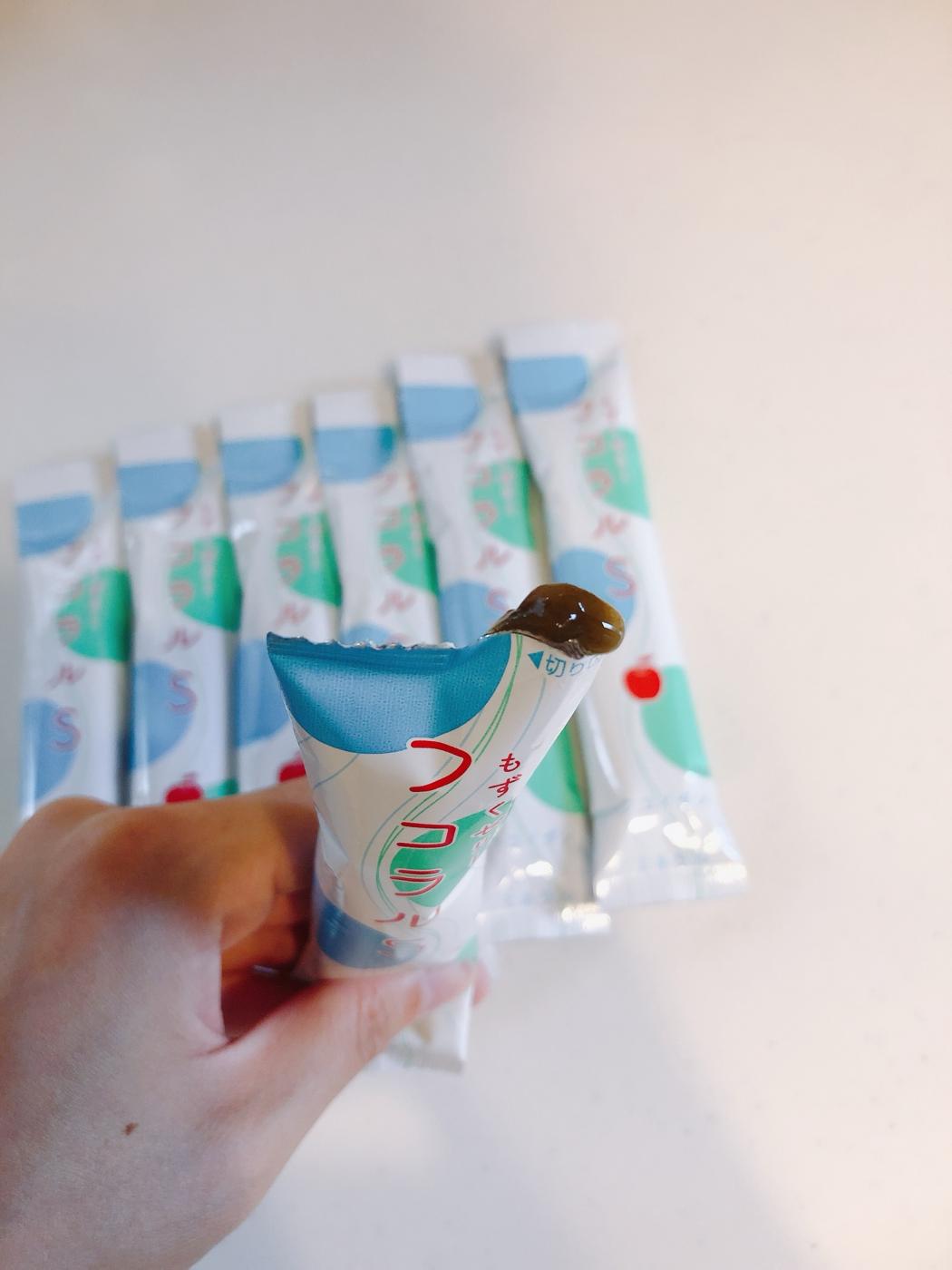 先端は手で切れるようになっていて、中身を出してみると、その見た目はいかにも「もずく」。もずくが苦手な私でもたべれました。なんで苦手なのに食べれたの?って思う方もいるでしょ。それはまったくもずくの臭いがしない!そして味が本当にりんごゼリーで美味しい。からです。
