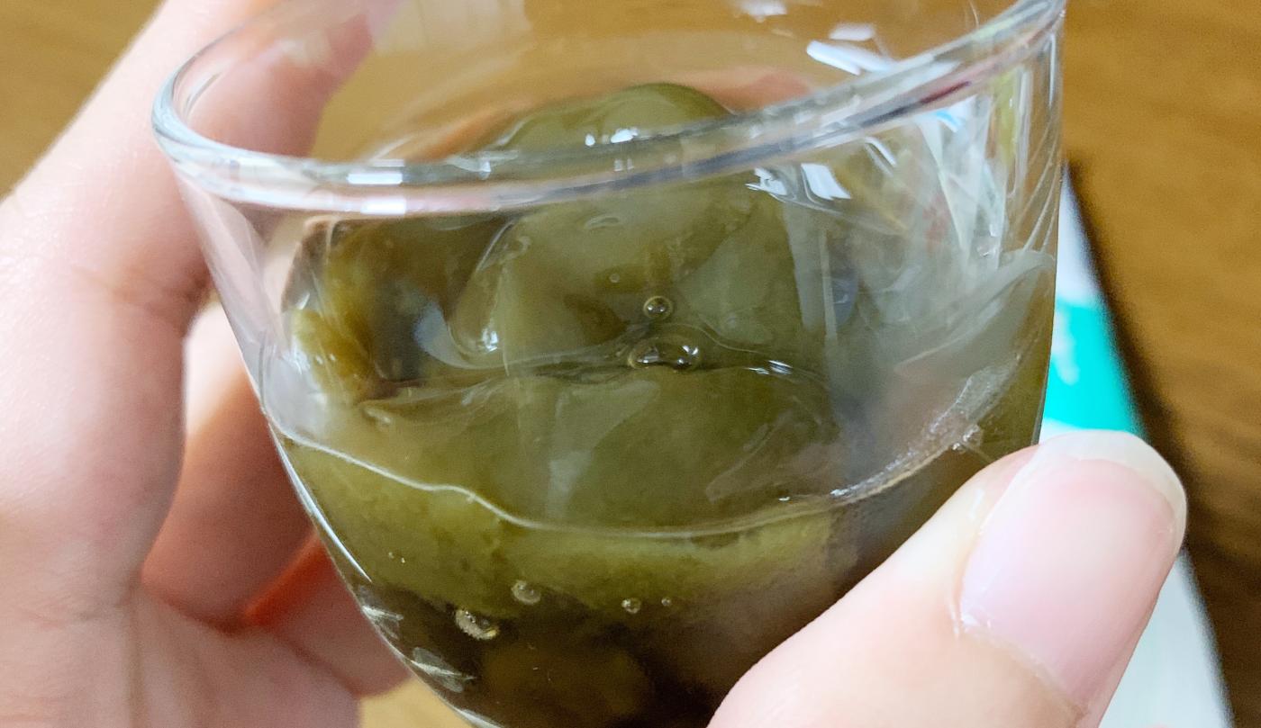 こちらのゼリー、カップに出してみるとまさにもずく!という色をしていますが、食べてみると普通に美味しいリンゴゼリーです。