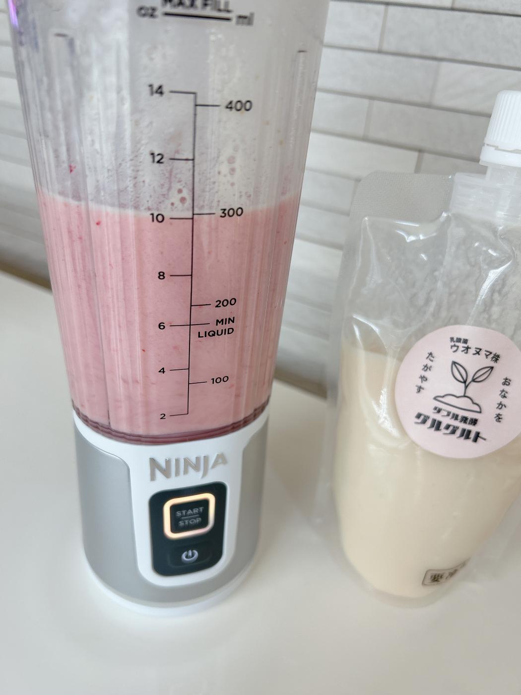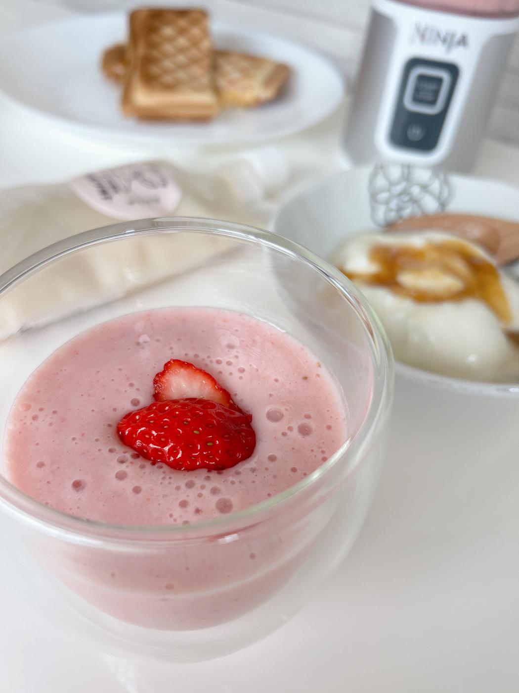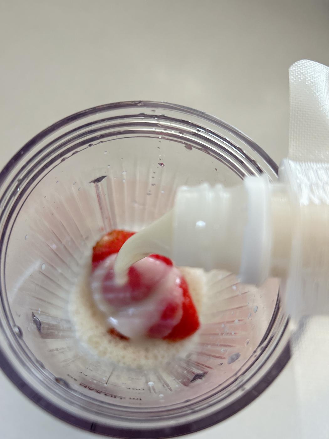 今回は、いちごの豆乳スムージーにしてみたよ。材料は、豆乳:グルグルト1:1、いちご、てんさい糖を入れてミキサーへ。