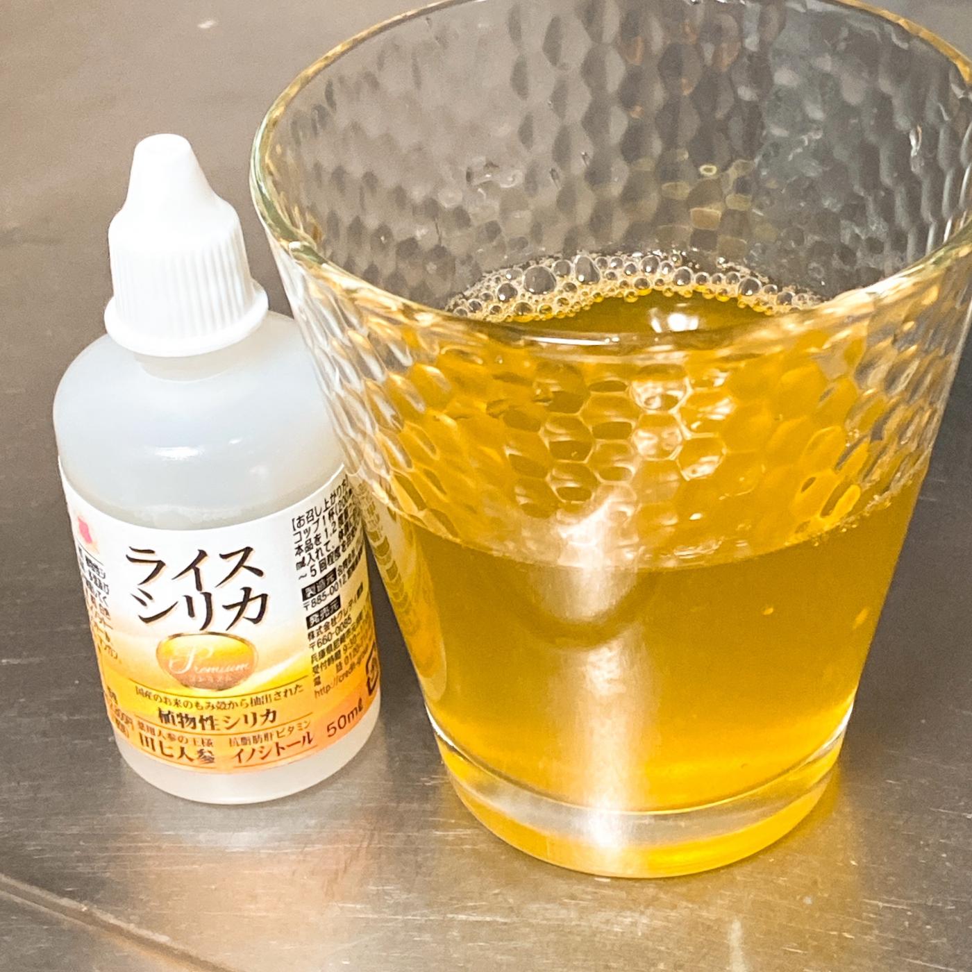 飲み方はとても簡単で、コップ一杯(200cc)の飲用水に、 「ライスシリカプレミアムを3.0~3.5ccを目安にいれ、一 日5回以上を目安に飲むだけ‼️