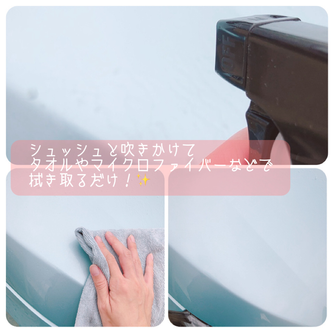 使い方は超簡単。いつも通り洗車を行った後、ミストタイプなので車体にそのまま吹きかけてタオルやマイクロファイバーなどで拭くだけで完了。不器用な方や初心者さんでもとても簡単🔰ポイントは始める前にボトルをしっかり振る事。
