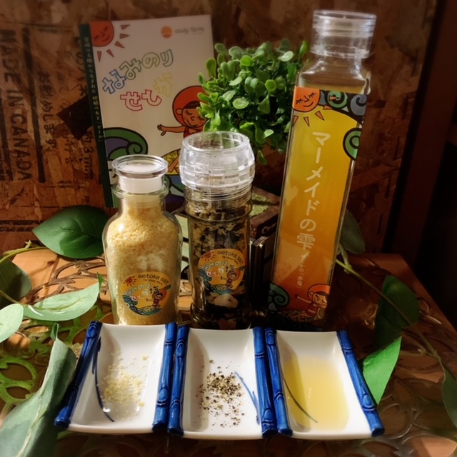 なみのりせとか塩、なみのりせとか塩ガーリック、マーメイドの雫せとか水塩の3種類のお塩のセットが届きました~♪