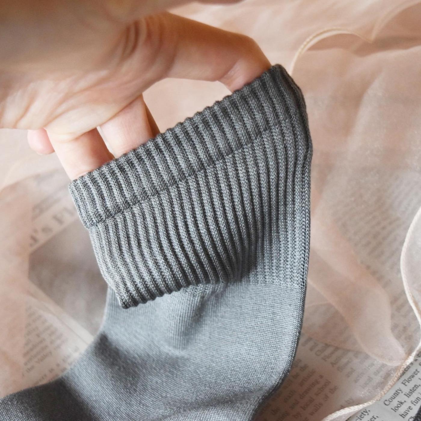 足首まわりは、滑らかなリブ編みで、これがとても好み♪チャコールグレーも汚れが目立ちにくい色味で、気に入っています。他にも、 きなり(アイボリー) があるそうですよ♪