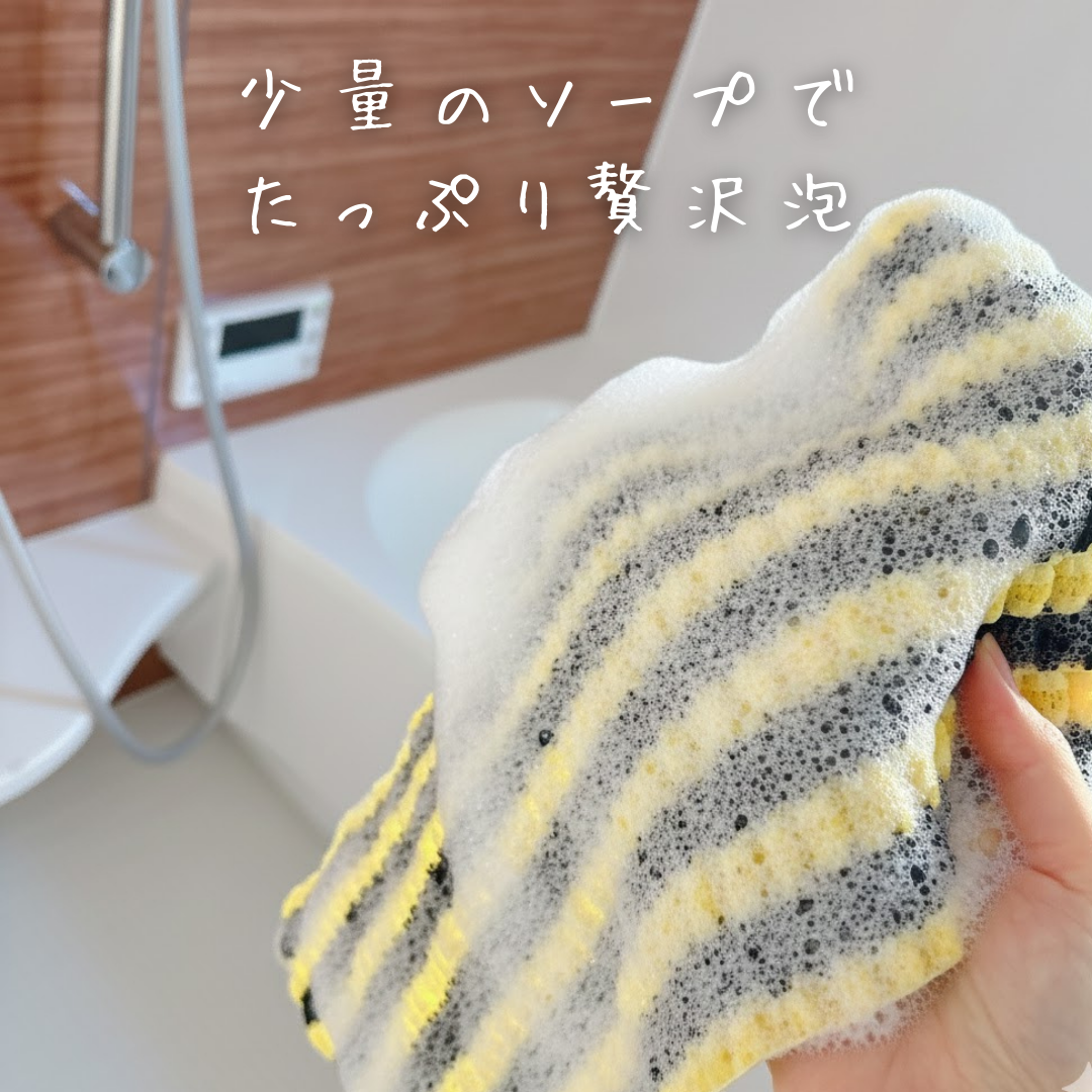 次に「肌あたり」について。見た目のトラ柄(黄色と黒の織り)から、少し硬めなのかな?と想像していましたが、実際はとても「やわらかい」質感です。肌に触れた時にチクチクするような刺激が全くなく、なめらかに滑るような感覚で洗うことができます。それでいて、汚れはしっかり落ちているような安心感があり、まさに「優しいけれど頼もしい」使い心地です。