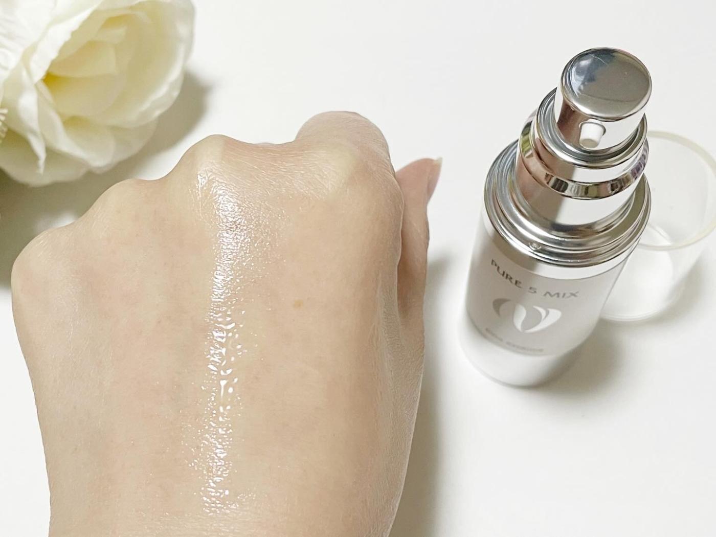使い方は、洗顔後の肌に化粧水で肌を整えてから、ピュア5ミクスを1から3プッシュほどの量を目安に手のひらに取り出してから、気になる部分を中心に顔全体になじませてその後は乳液やクリームで仕上げます