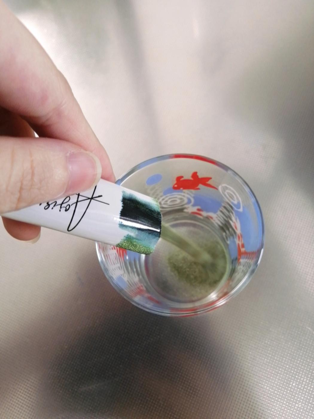 朝は、お気に入りの金魚のコップに青汁美人を入れて、お水を入れてかき混ぜます