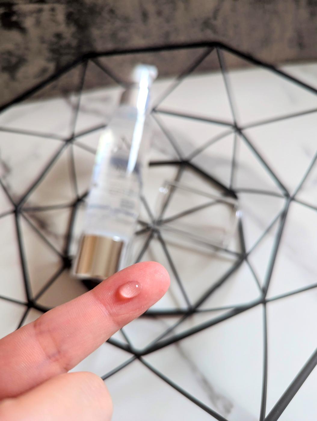 実際に1プッシュ手に取ってみると、プルプルとクラッシュゼリーのような潤いを感じられるエッセンスで、指で触ってみるともう少しで糸を引きそうなお肌にくっついてくるようなテクスチャでした。