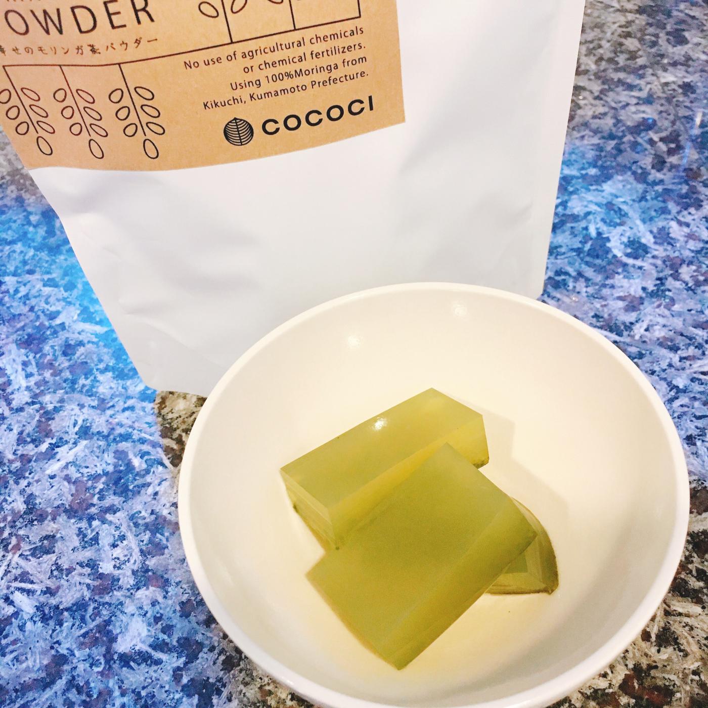 寒天、水の分量は購入したものを参考にしています。寒天、水を温めた後、しあわせのモリンガ茶パウダーを溶かしてから冷やし固めるだけ。今の季節にぴったりの爽やかな和菓子に。甘みがないので、練乳を少しかけて食べても美味しいです。