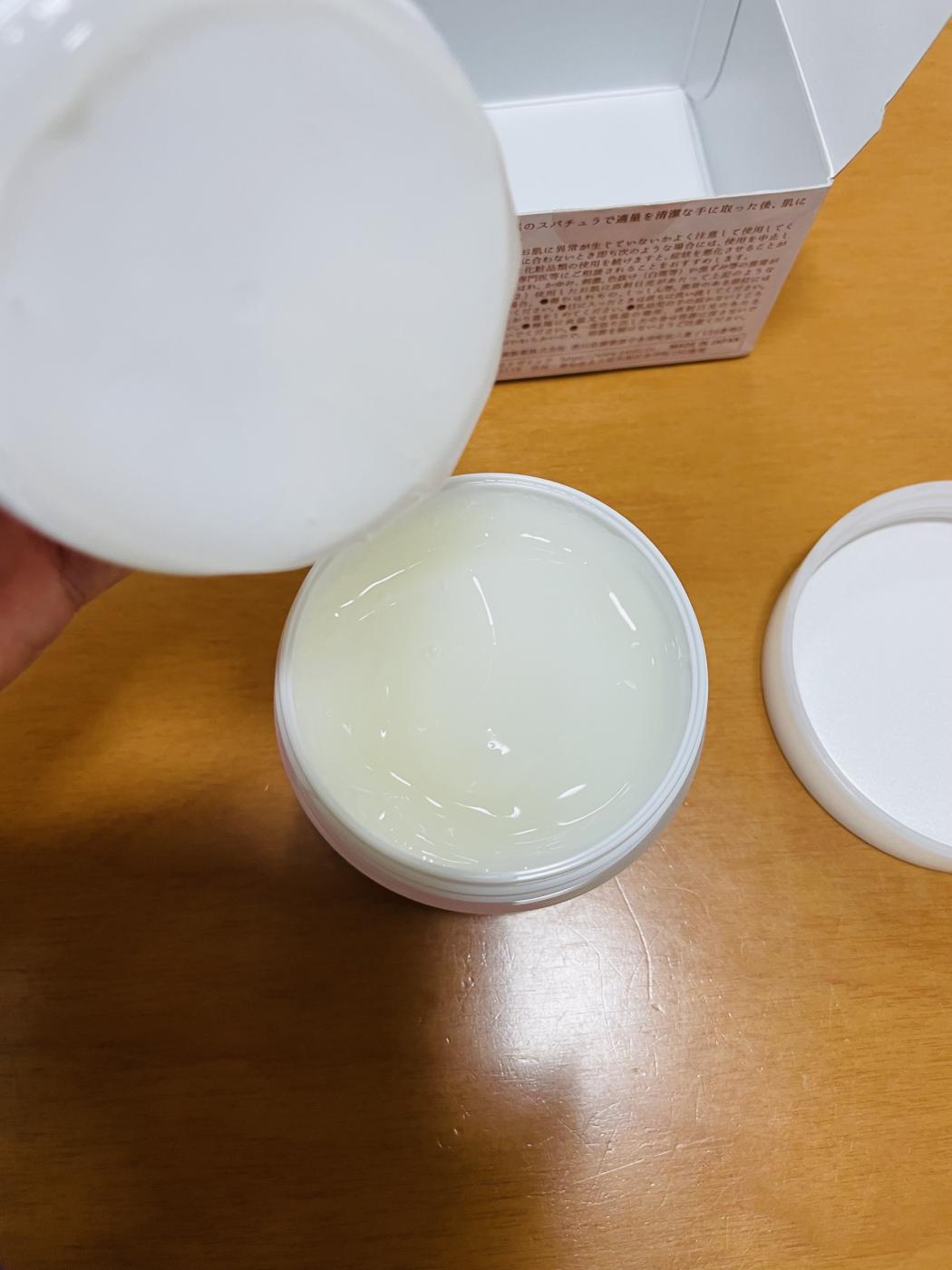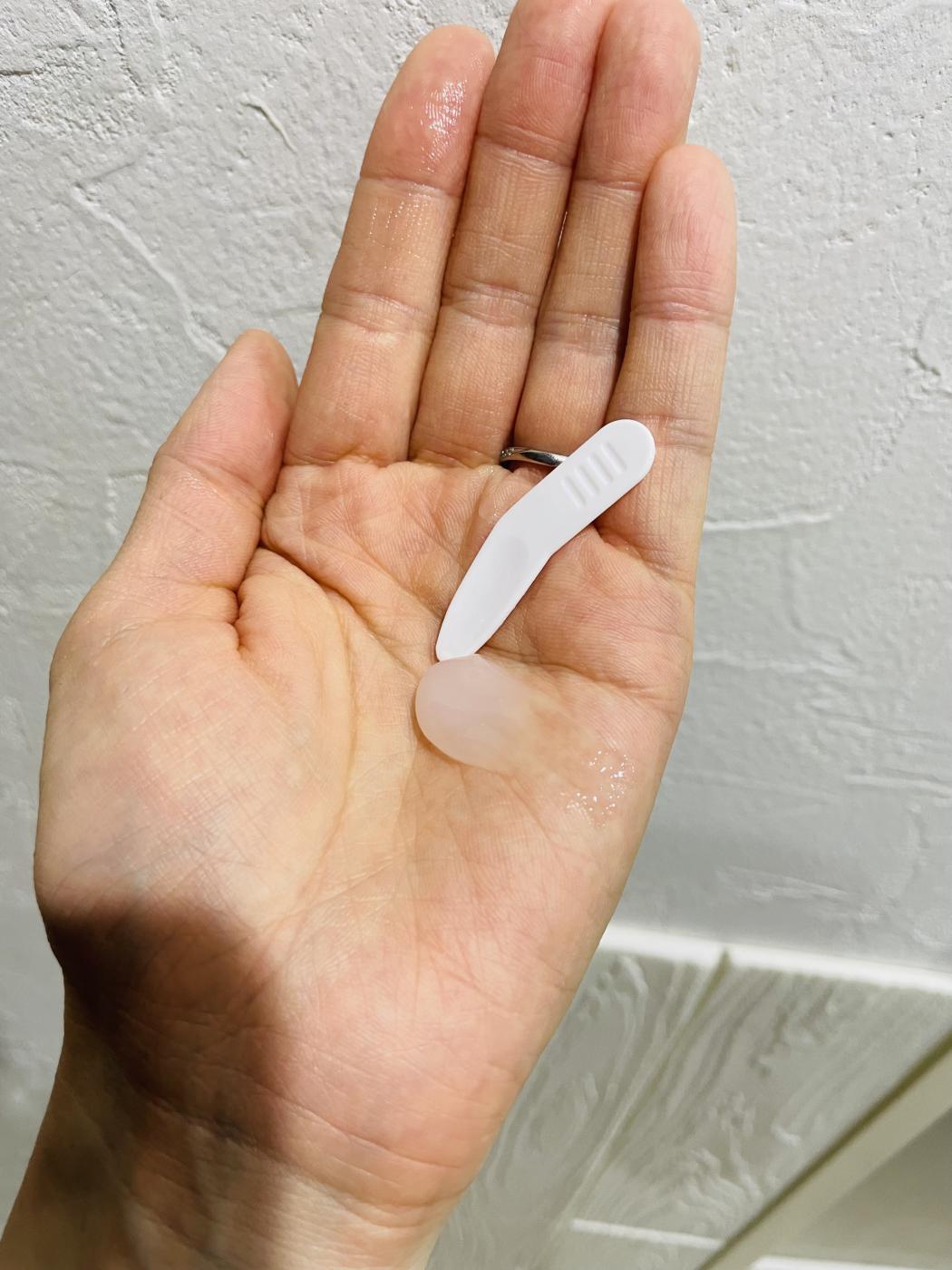 開けてみると、乳白色のジェルがたっぷり入っています。附属のスパチュラを使用すると、すくえたのは1センチくらいでしょうか。少ないなと思いましたが、肌ののせてみたら伸びる伸びる。少ない量でもしっかり潤ってくれました。私は最初のひとすくいで顔全体にのせ、乾燥しがちな部分と肌のハリが欲しい部分だけ重ね付けをしました。