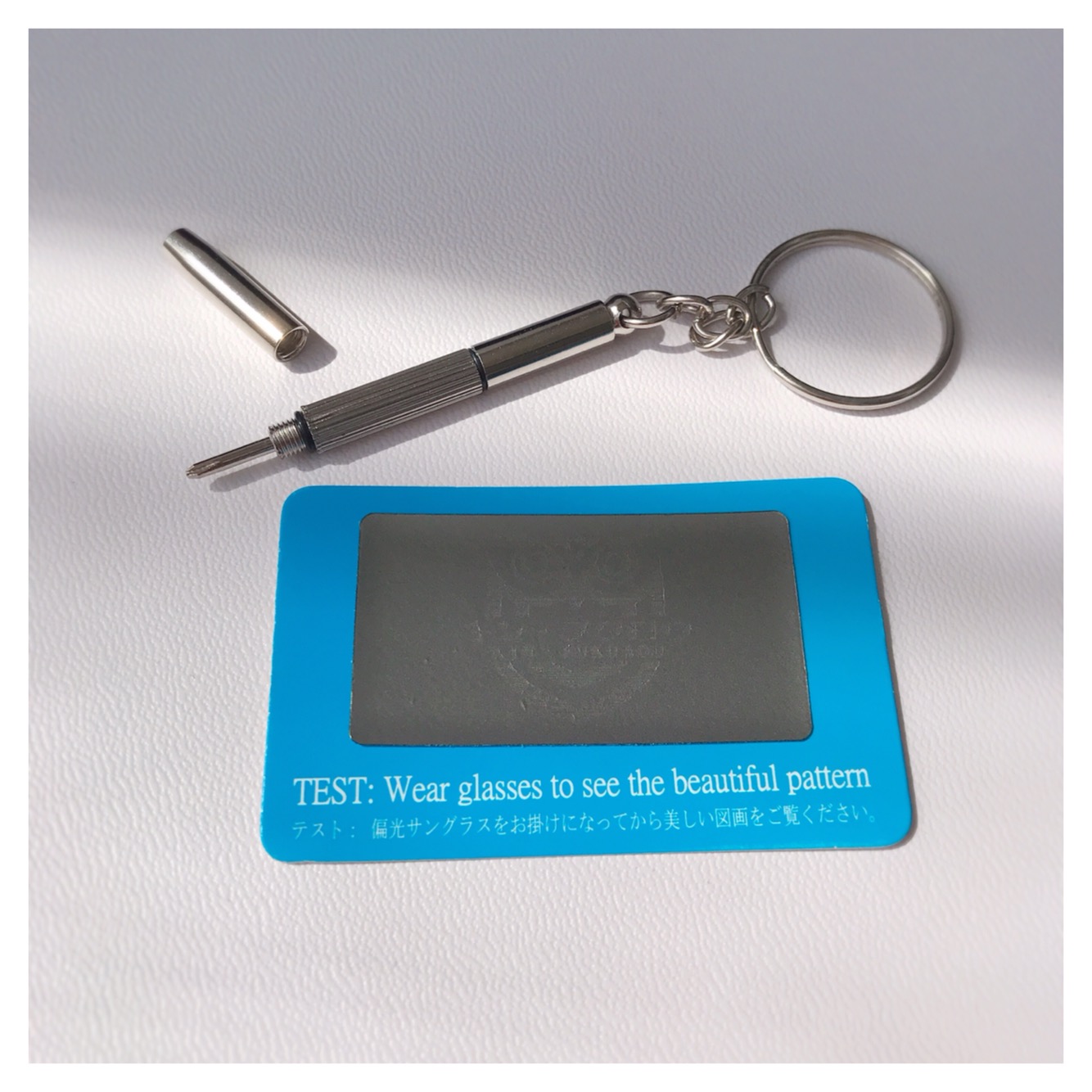 届いてみたら先ずはそのセット内容に驚き…!(*_*)ケースや眼鏡拭きは勿論、布の収納袋やミニドライバー、さらには偏光テストカードまで入っているんですね…!