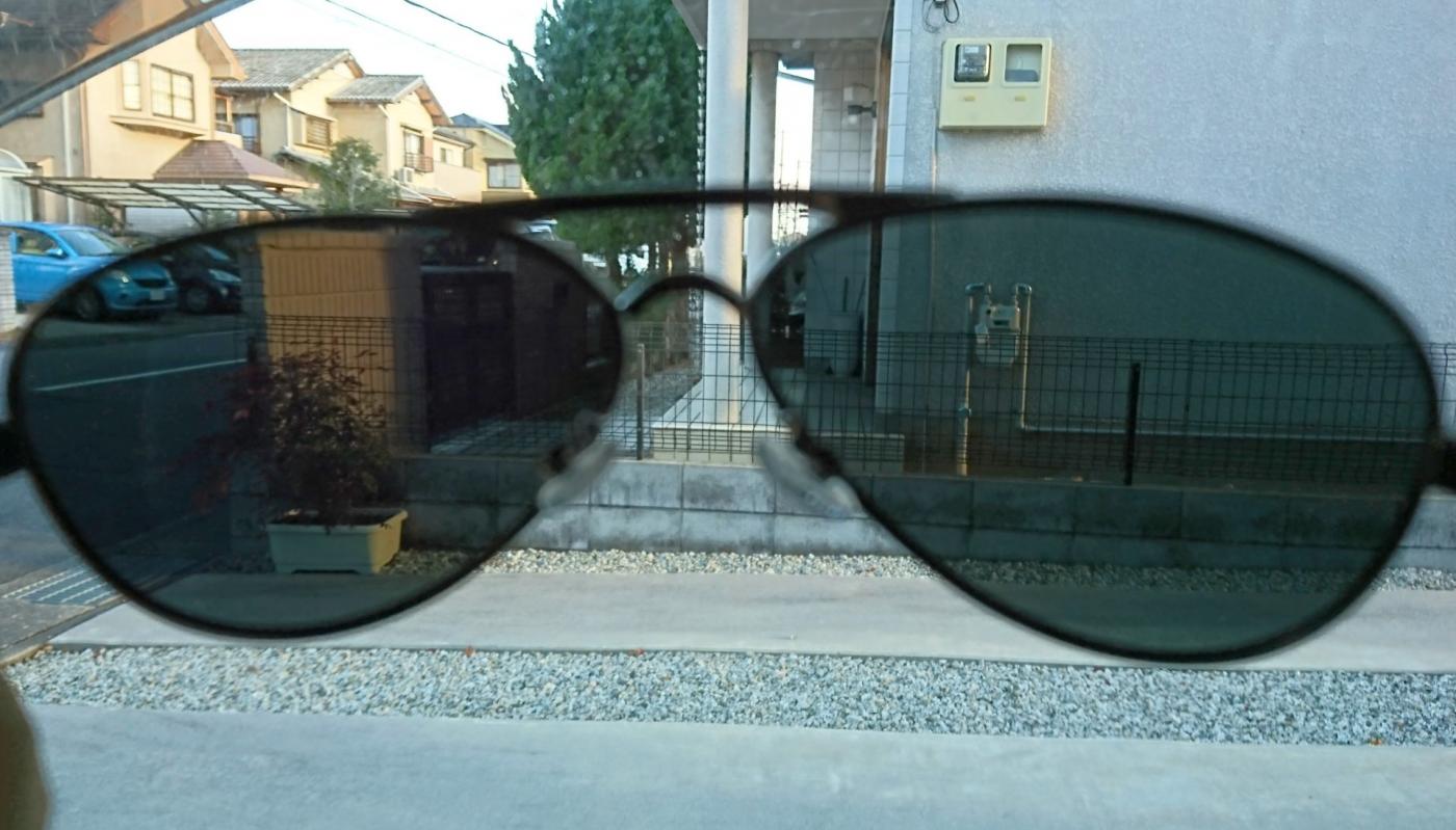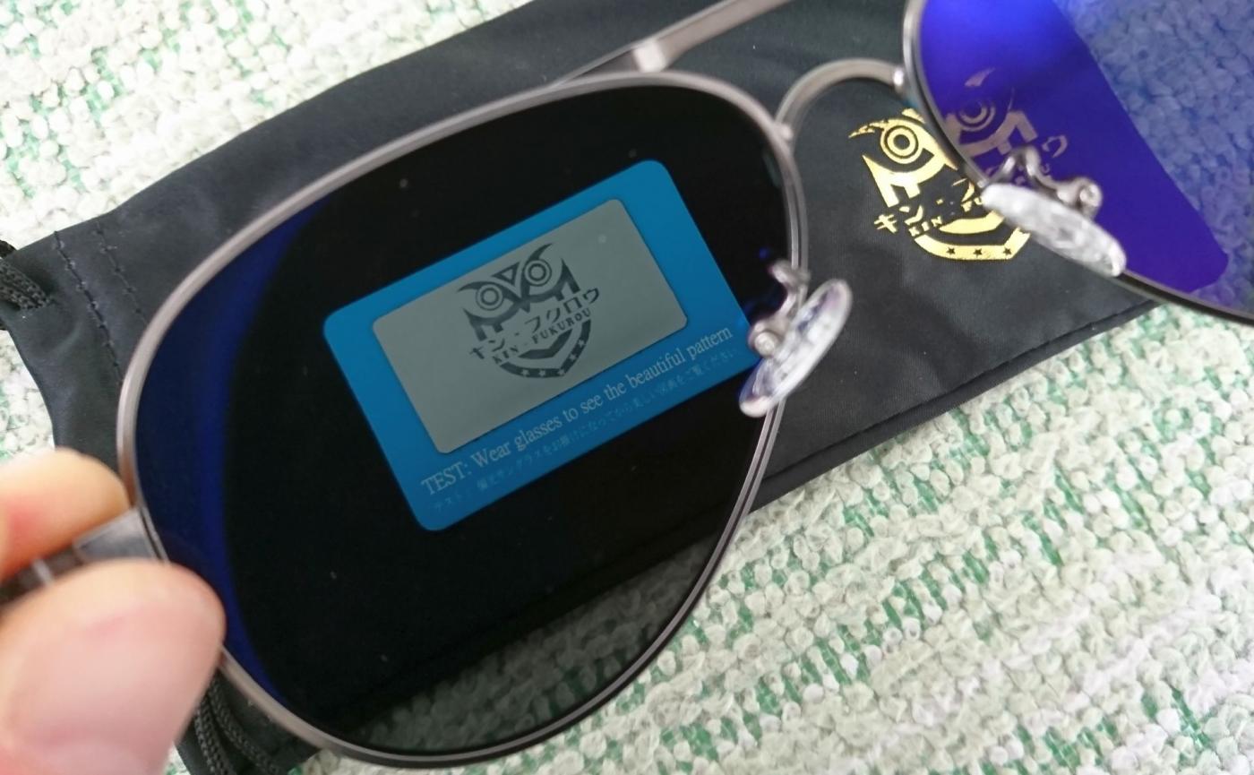 サングラスは西部警察の渡哲也を思い出すイカツイ形状、でも真っ黒じゃないです。同封のプレートは裸眼では無地の金属板に見えますが、このサングラスを通すとロゴがくっきり見えて偏光レンズを使ってることが判ります。
