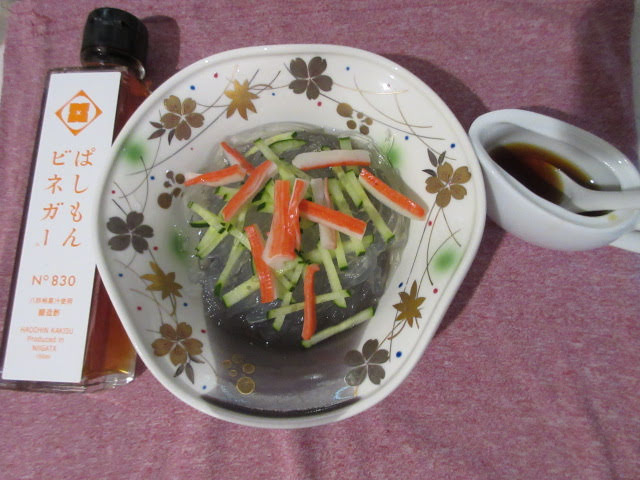 先ずは、柿酢の三杯酢のところてんです。ところてんの水を切り、小皿に盛り付け、あらかじめ刻んでおいたキュウリとカニ蒲鉾を盛り付けます。