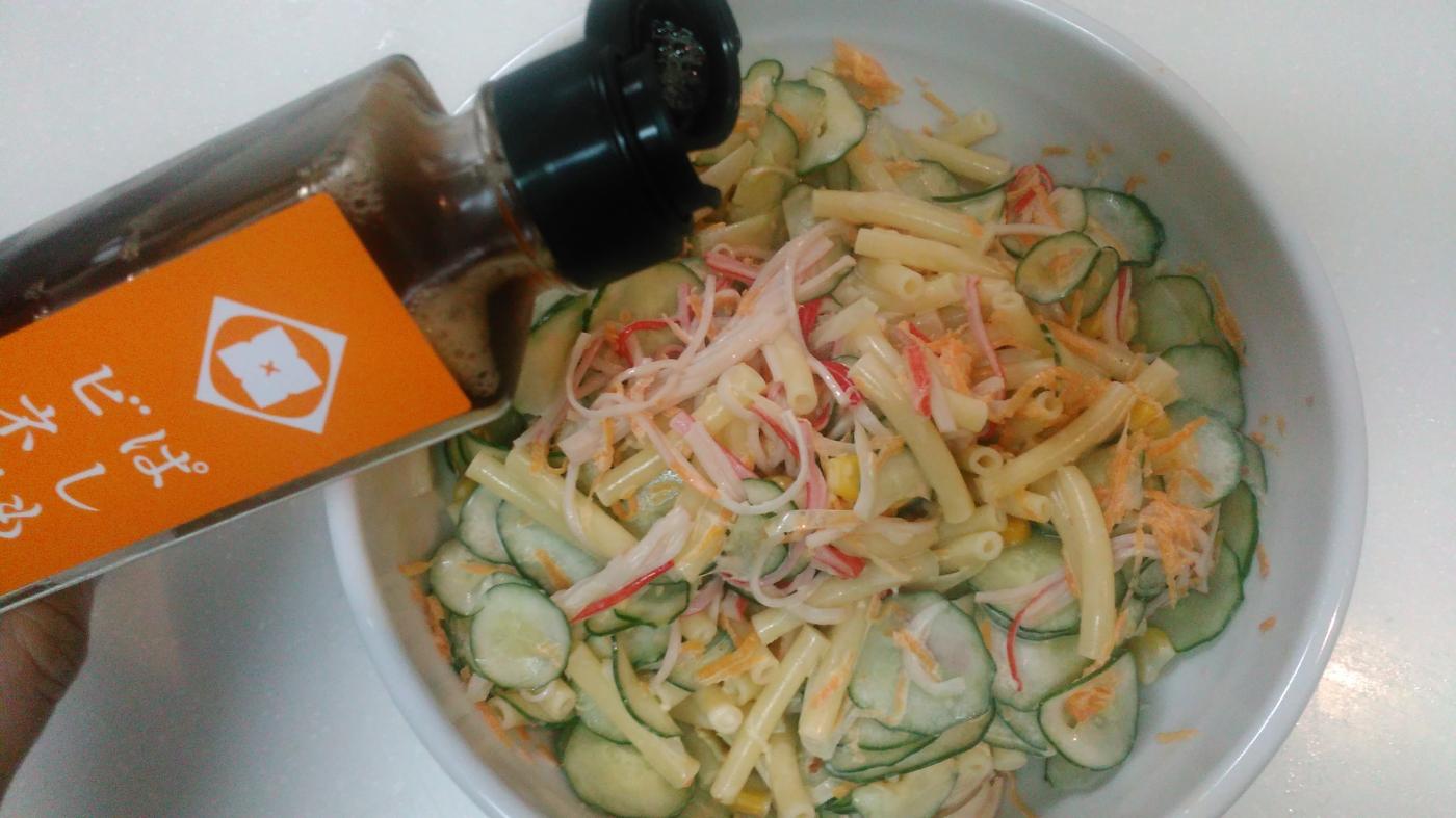 次は、いつものマカロニサラダに、マヨネーズに対して、4:1くらいの量で「ぱしもんビネガー」を加えました。