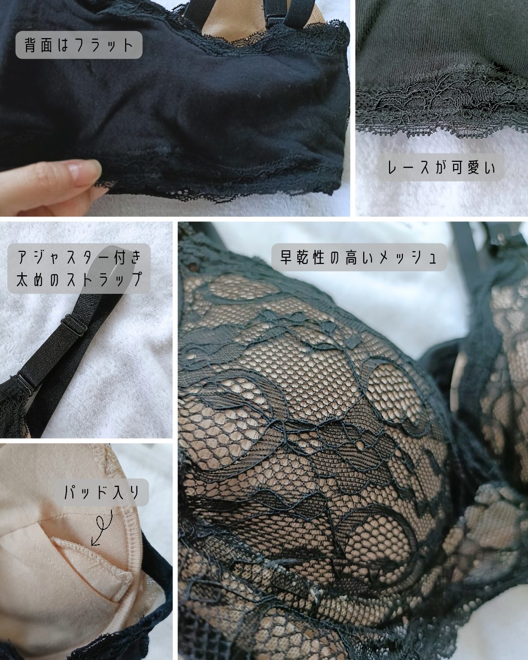 でも、わりとノンワイヤーってホールドが弱くて横に流れたりキレイに見えないことが多いのが難点だったんだけど…これ背面のフラット仕様を見てビックリ!