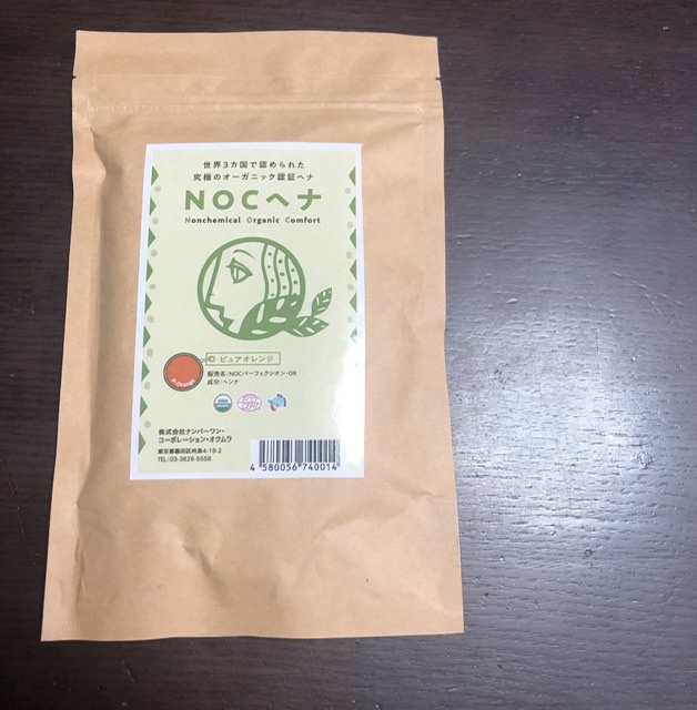 NOCヘナは世界で最も審査基準が厳しいといわれるアメリカのUSDA、世界最大のオーガニック認定団体であるフランスのECOCERT、原産地であるインドのインディアオーガニックの認証を受けている天然100%のヘナなので化学生物は一切使われていません。色によって天然の成分の種類は違いますが、私が使ったピュアオレンジは原料成分はハンナのみ。びっくりですね♡