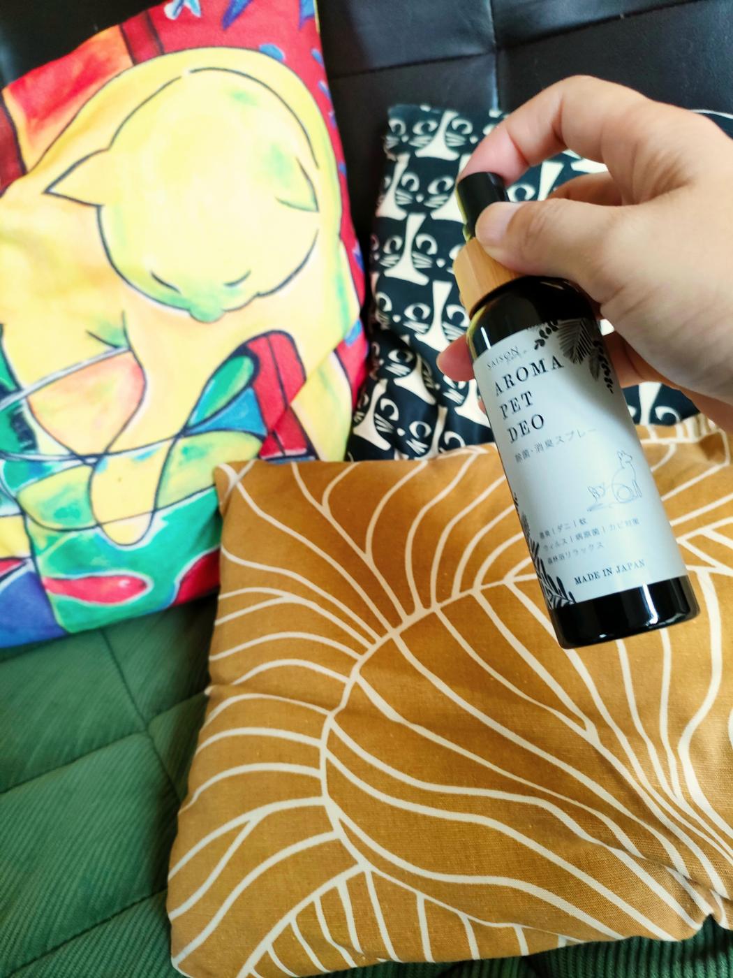 その他、愛猫も良く乗っているクッションやラグなどにもシュッシュッ。手軽に清潔を保てています。