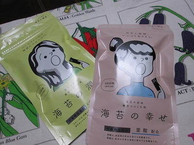 体と目によい海苔をいただきました。海苔の瞳(ビタミンA配合)海苔の幸せ(葉酸配合)葉酸は妊娠前や妊娠中には、サプリなどで摂取していましたが、赤血球の形成を助ける栄養素です。葉酸は胎児の正常な発育に寄与する栄養素とおもっていましたが子供だけでなく大人にもやはりよいものなんですね。ただし1日の摂取目安量を守ってくださいとのことです。