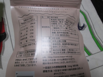 海苔の幸せをたべてみるとまず味がおいしいです。480円(税抜)(1袋あたり8切40枚入り)でとってもかわいいイラストの袋にはいっていてこのまま子供がお弁当にもっていって自慢になりました。