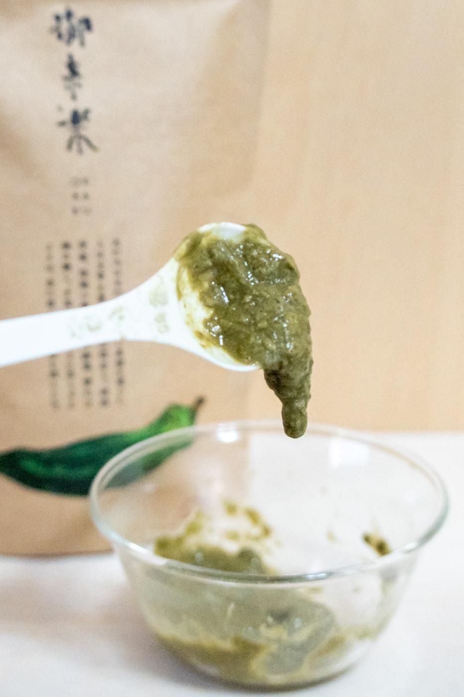 小さじ1杯をお湯に溶かして練り上げると、ねばねばオクラペーストの完成。