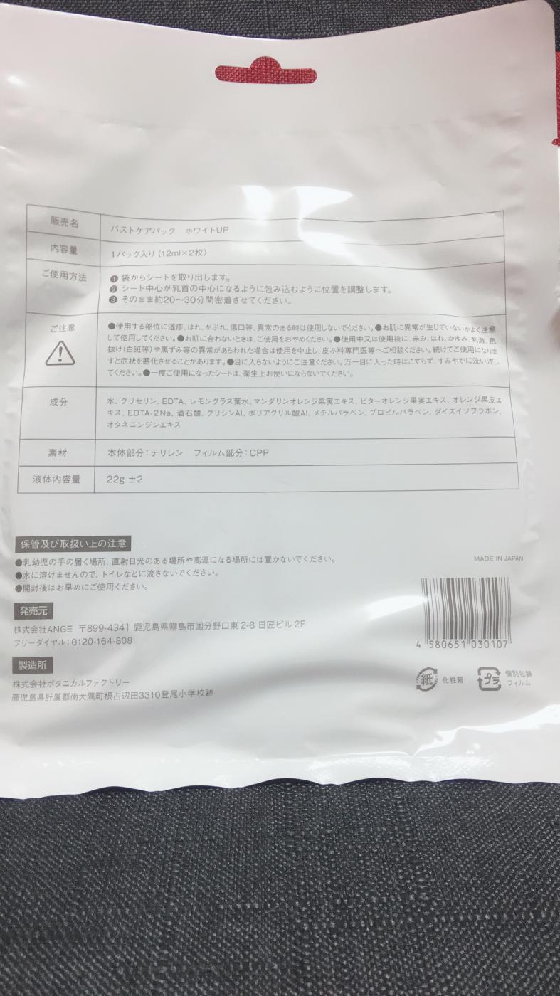 「バストアップ バストパック」を使用させていただきました♪ なんと、バスト専用のパックです! 配合...