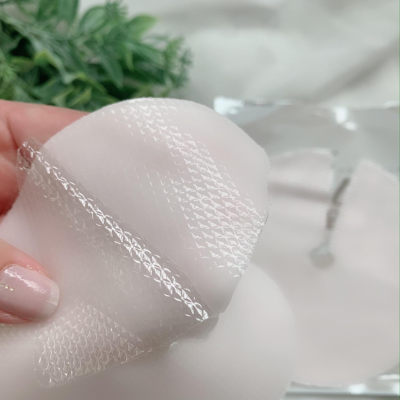 シートのフィルムを剥がし、円形のパックでバストを包み、グッと持ち上げるようにしながら貼りました。