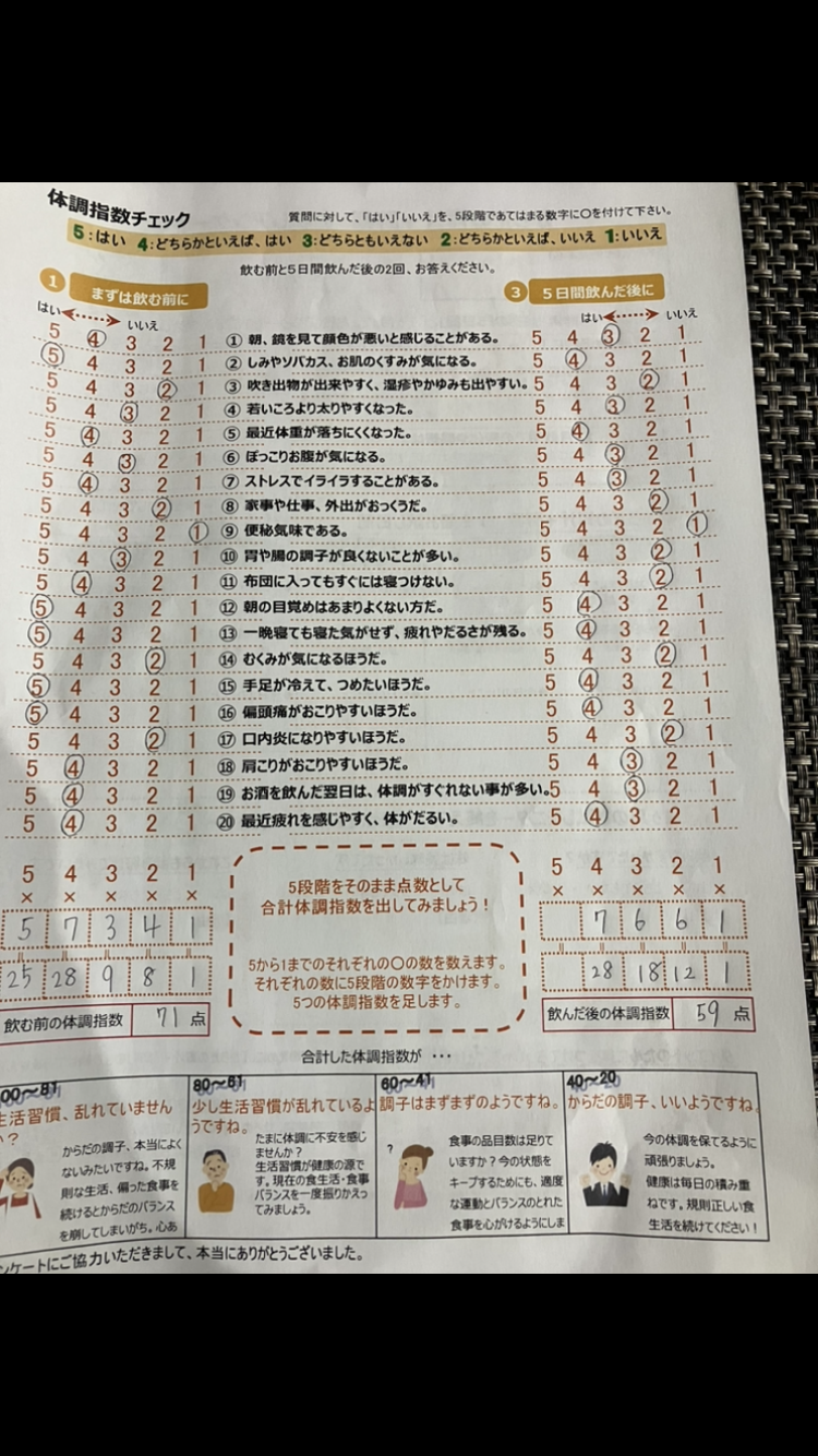 5日間飲んだ後に再び体調指数をチェックすると、なんと、59点に。わずかですが体調に変化がありました。飲む前は手足の冷たさ、それにともない、なかなか寝付けず、疲れが取れないまま朝を迎えることが度々ありました。しかし、それまでのように手足の冷たさを感じなくなり、朝の目覚めと疲労感に変化が…。