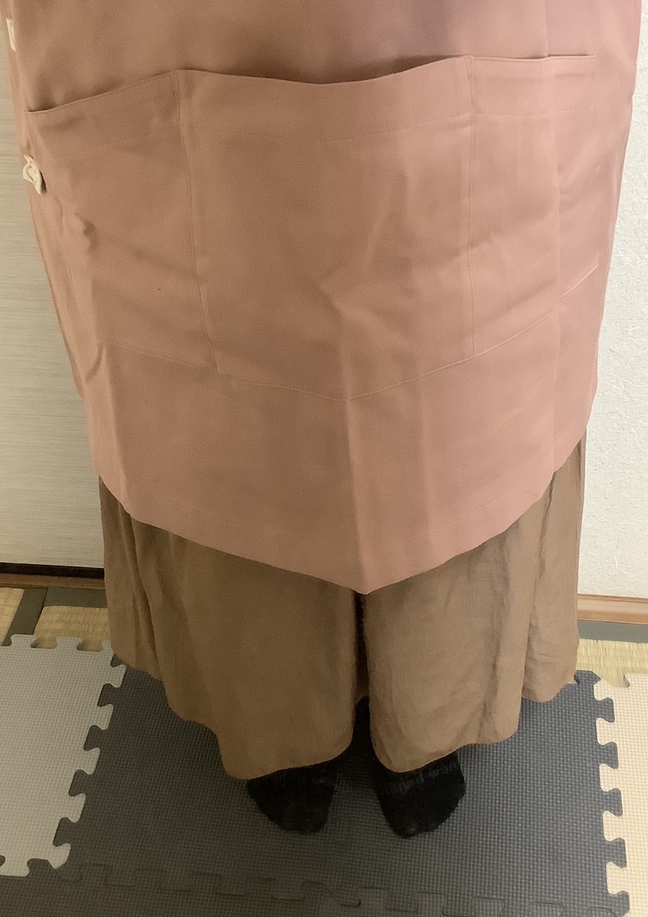 着丈は150センチの私で膝上くらいなので、やや短めで動きやすいです。