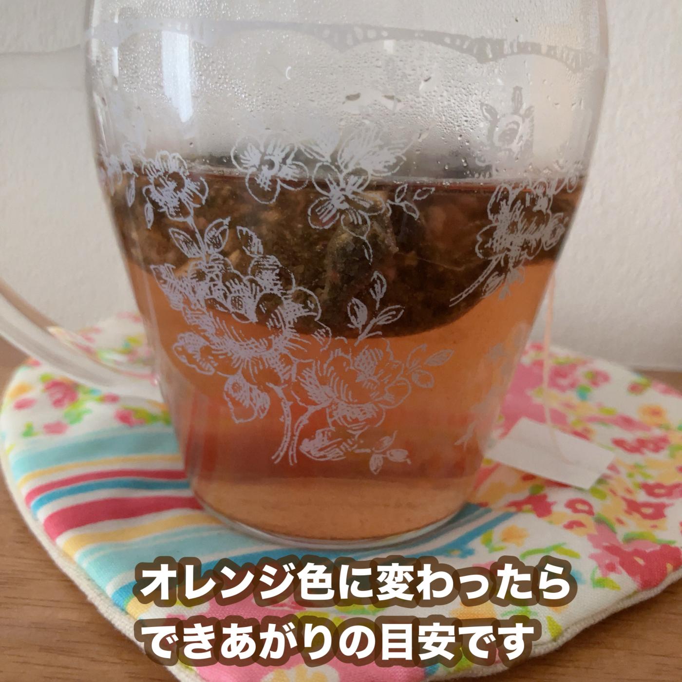 約200mlの熱湯を注ぎ1~2分ほど蒸らします。最初は薄いピンクの色で、少し置いてオレンジに変わったらできあがりの目安です。