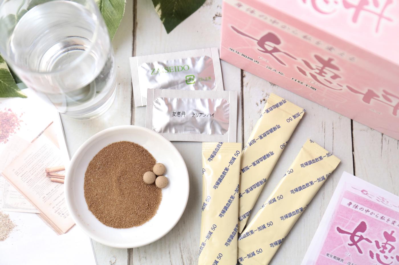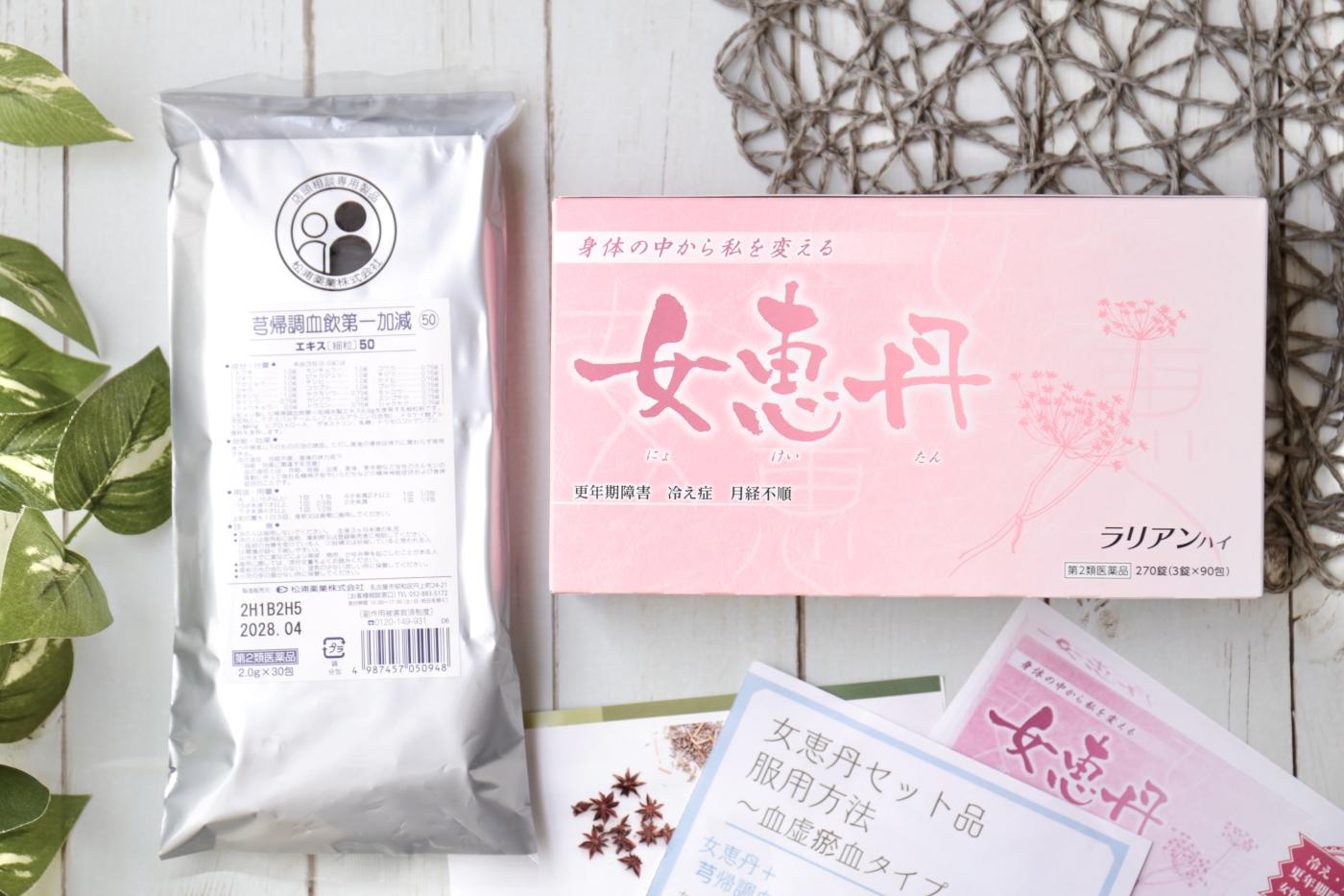 女恵丹は1箱90包入りで1日3回、芎帰調血飲第一加減は1袋30包入りで1日1回の服用です。