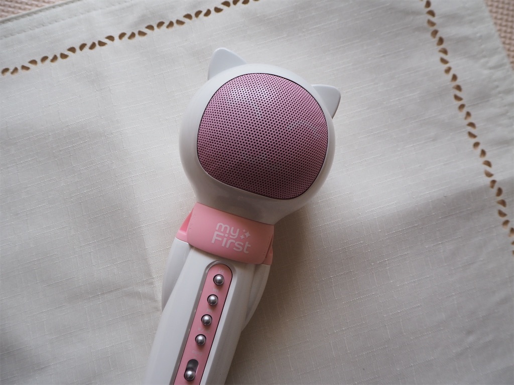 猫の形をしたマイクに顔が書いてあり、白基調にピンク色でかわいいマイクです。