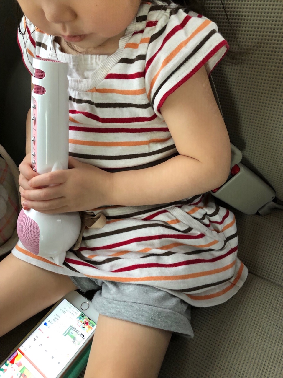 うちの子は、車の中では大人しくしてくれず、いつもチャイルドシートを勝手に外しては動き回る…そんな感じなのですが、このマイクの効果は絶大でした。