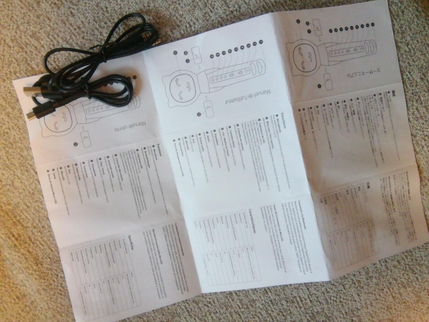 充電用のケーブルとAUXオーディオ接続ケーブルとクイックガイドが入っています。