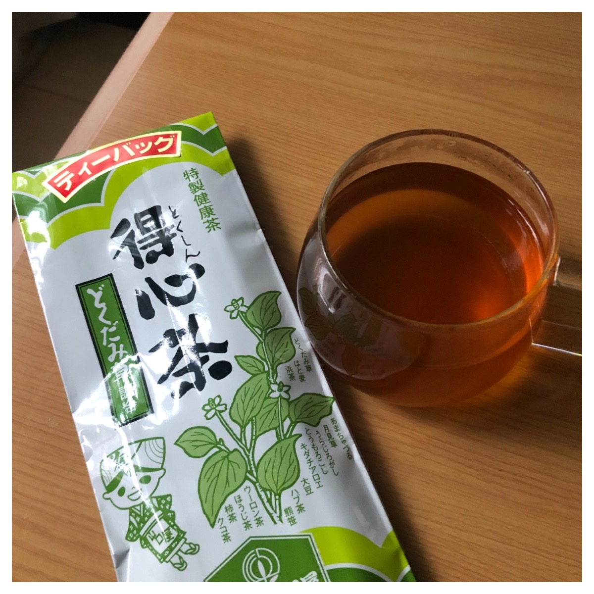 乾燥したどくだみにはと麦、ハブ茶、とうもろこし、浜茶、あまちゃづる、月見草、クコ茶、大豆、烏龍茶、ほうじ茶、キダチアロエ、柿茶、熊笹、うらじろがしの15種を配合した健康茶です。