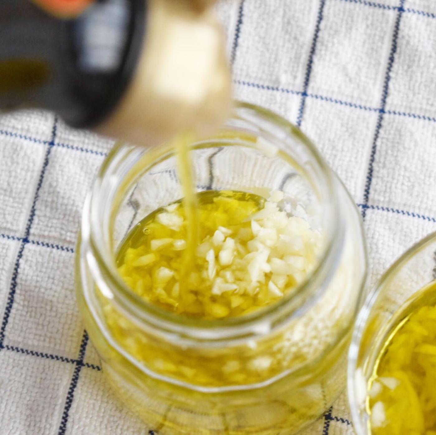 みじん切りにしたにんにくを煮沸消毒済みの瓶に入れて、そこにオリーブオイルを入れます。